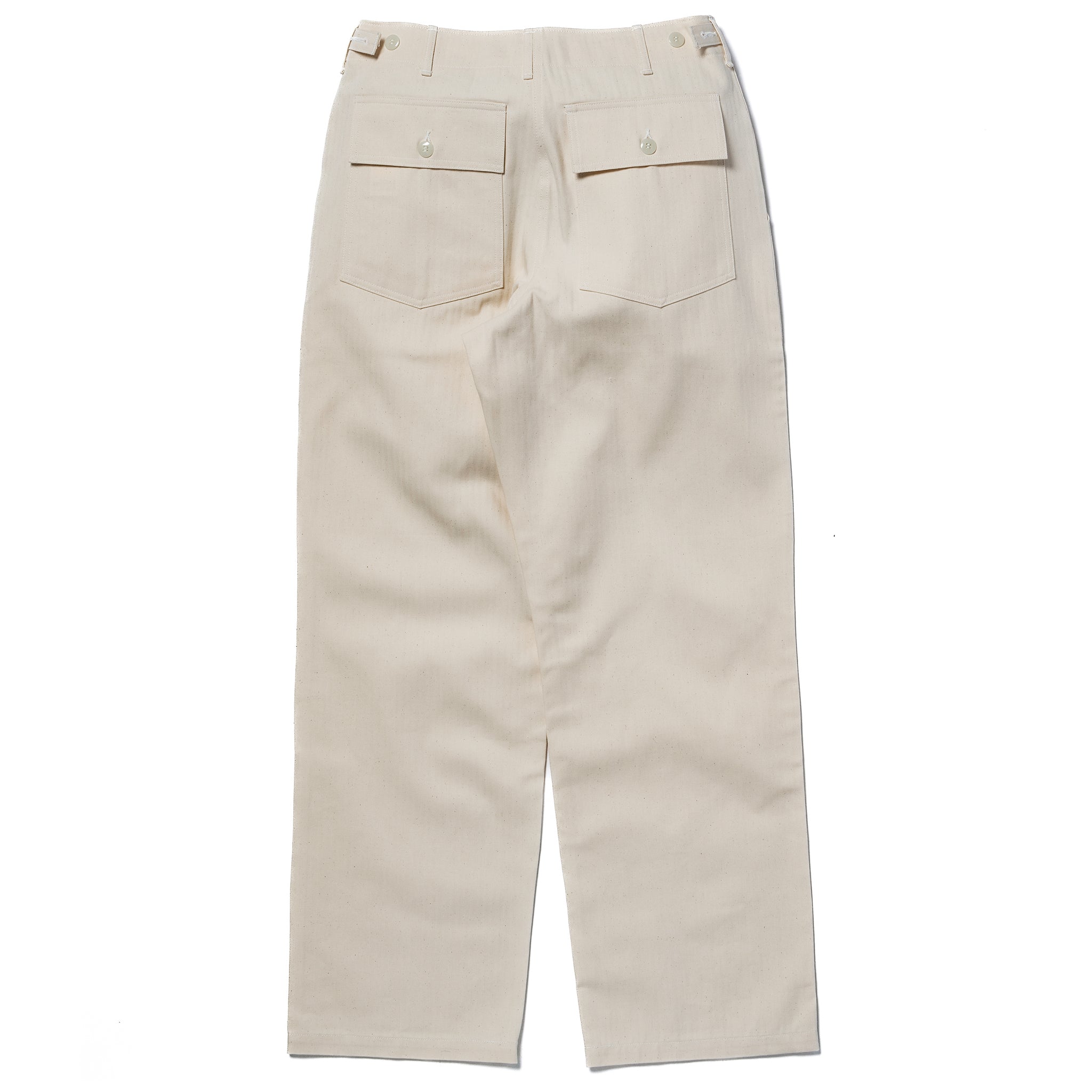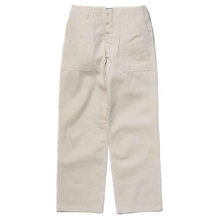 These Utility Trousers, a non-military interpretation combining the iconic fatigue pant pattern with WWII era Military Grade Cotton Herringbone Twill in its undyed form, have a comfortable and highly practical fit with a medium rise and wide leg. They employ white cotton stitching throughout and are closed with tonal off-white rounded Urea Buttons.