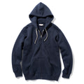 A hooded full zip loopwheel sweatshirt made in Wakayama, Japan, of 100% cotton on vintage loopwheel machines. Loopwheel machines are known to knit at a sluggish pace, with only a single meter of fabric produced every hour. When compared to contemporary manufacturing methods, loopwheel machines apply a very low thread tension allowing the production of an exceedingly premium and unique fabric. The resulting material feels like it has been hand woven, with a stretchy element to it, a quality that cannot be replicated by modern production techniques.