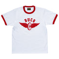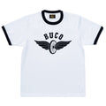 The BUCO TEE / FLYING WHEEL is an 8oz cotton cloth ringer tee, finished with a FLYING WHEEL logo, which became an iconic symbol of mid-20th-century motorcycle culture, representing speed and freedom, it resonated with the growing enthusiasm for motorcycling during this period. The rubber print logos at the front and back have been applied by hand at our Kobe headquarters.