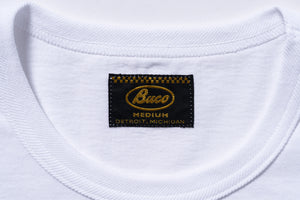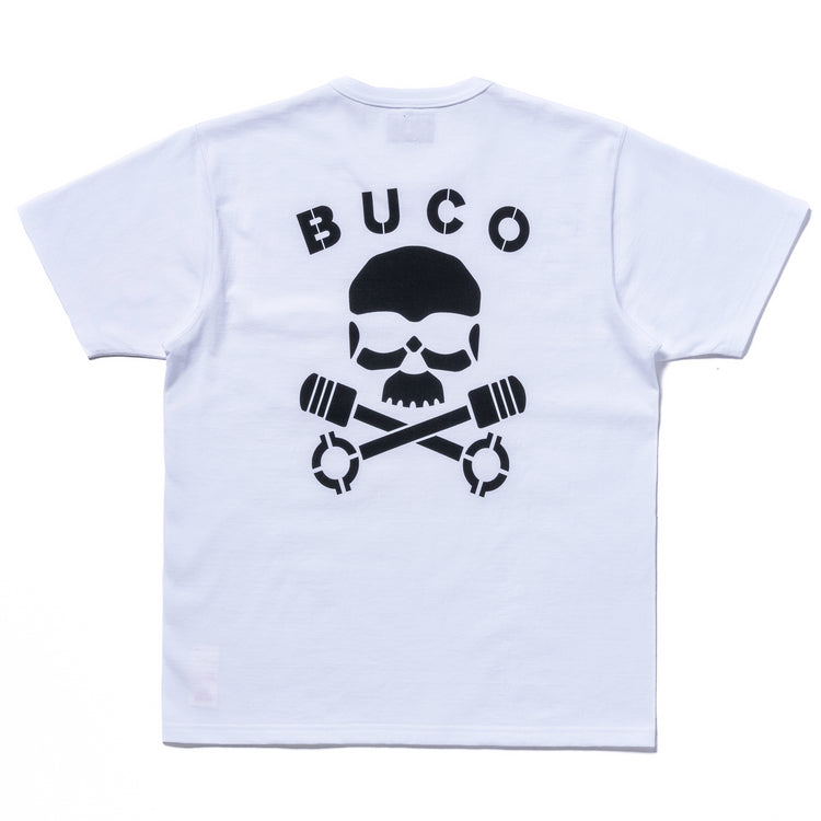 The BUCO TEE / SKULL PISTON is made from sturdy 8oz cotton and features a classic 1950s boxy fit. The binder neck ensures the neckline holds its shape through repeated wear and washes. The Skull & Piston design on the rear of the tee is hand-applied as a rubber print in our Kobe-based factory.