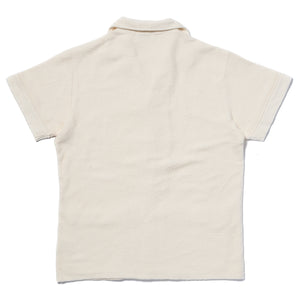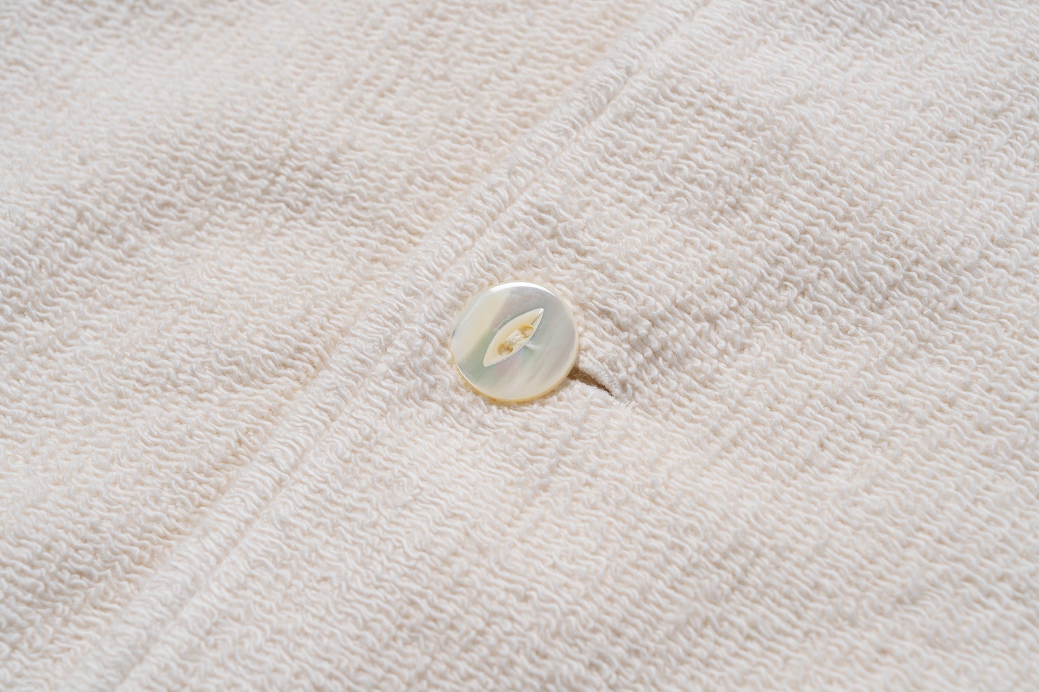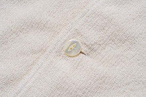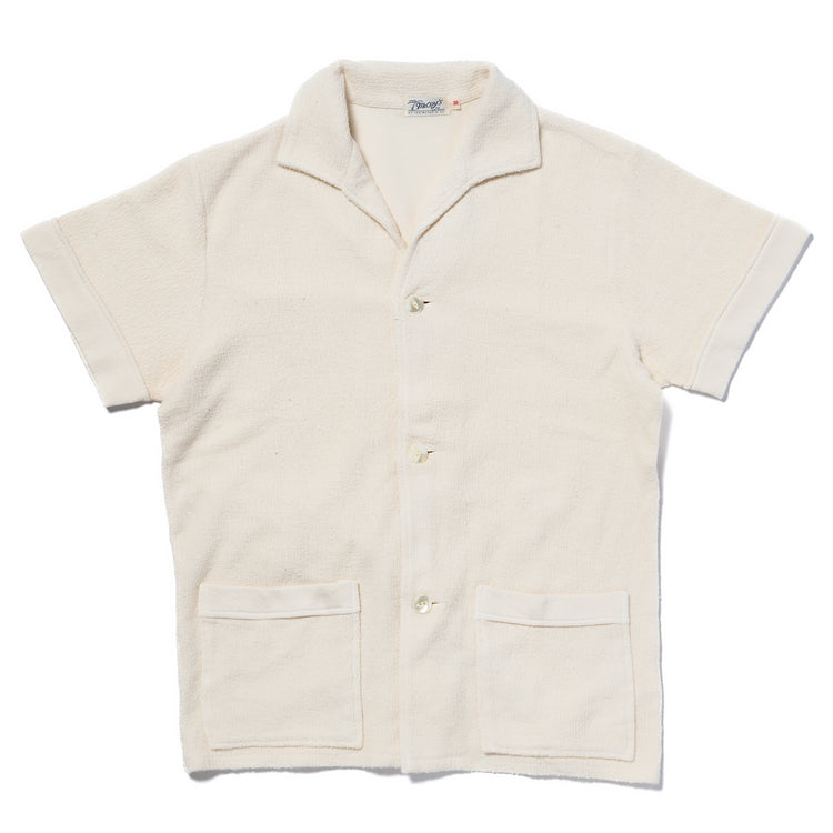 The COTTON PILE BEACH SHIRT is an eminently mid-century shirt with an takase shell button placket, constructed of a luxuriously soft and detailed pile fabric and finished with two lower waist pockets.