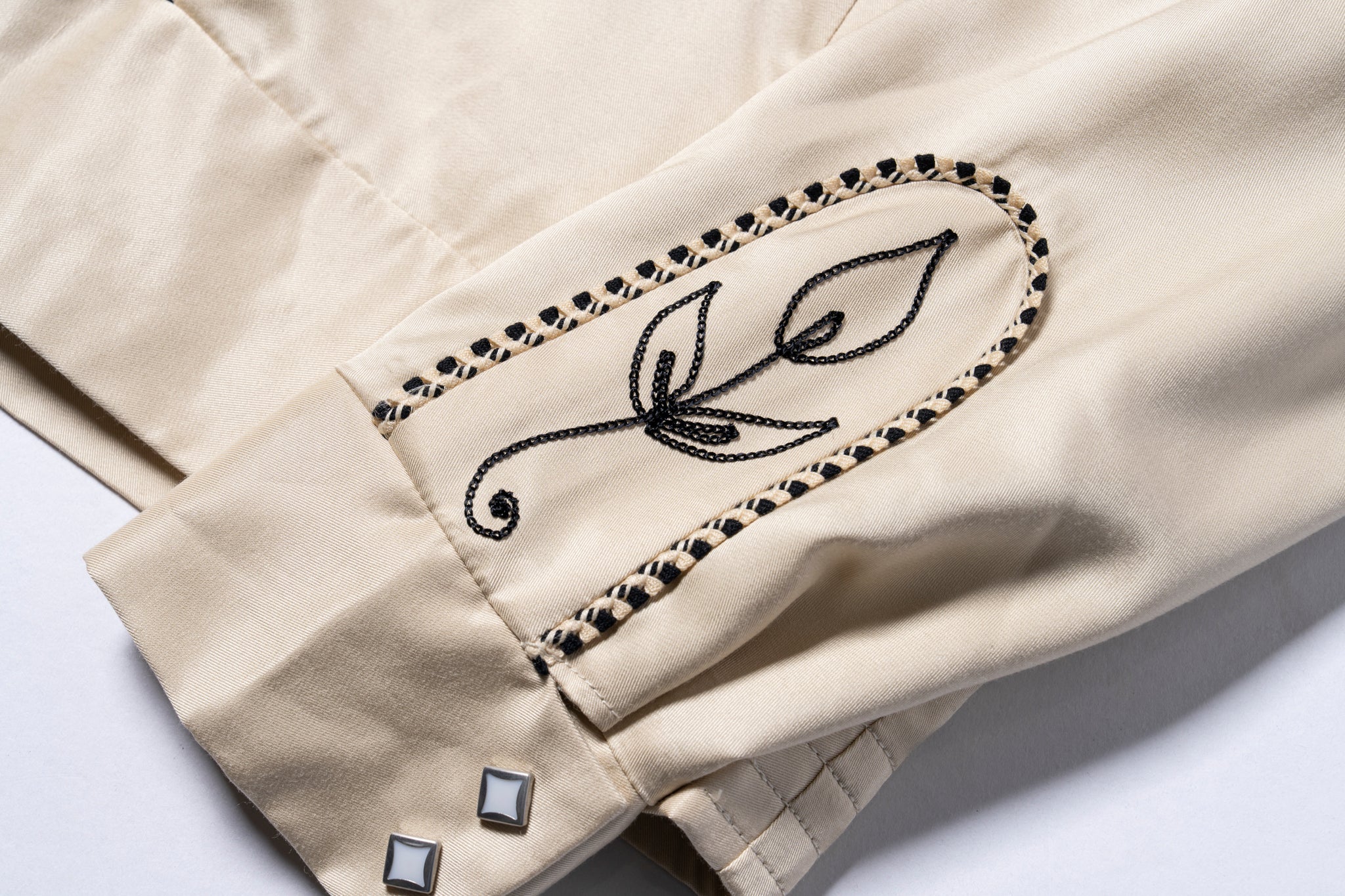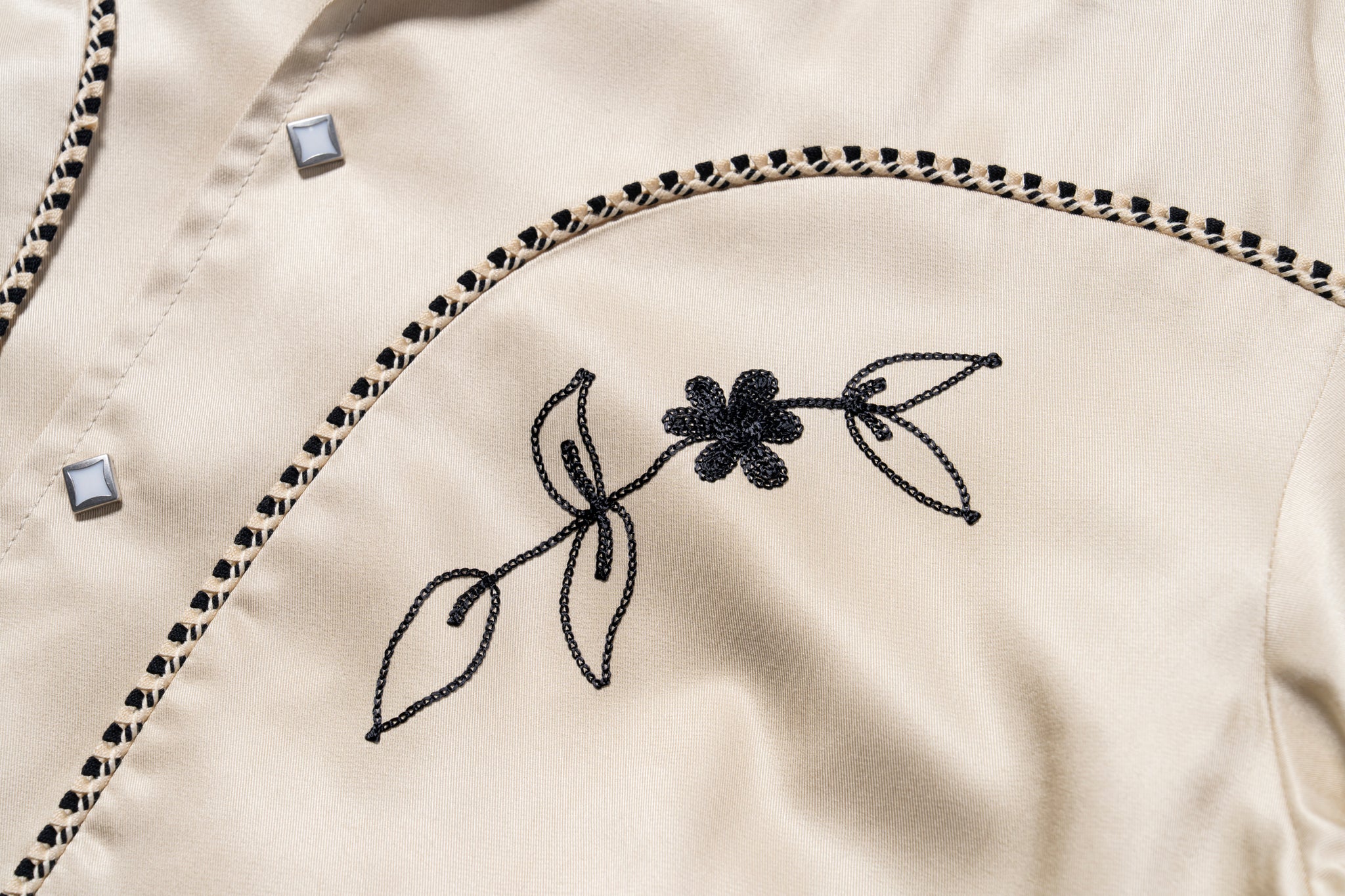 Our EMBROIDERED RAYON WESTERN JACKET is crafted in Japan from rayon cloth with a tencel lining for added comfort. It features piping details, a snap-button front and sleeve cuffs, slit pockets, and intricate chain-stitched floral embroidery.
