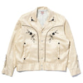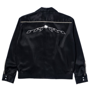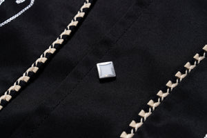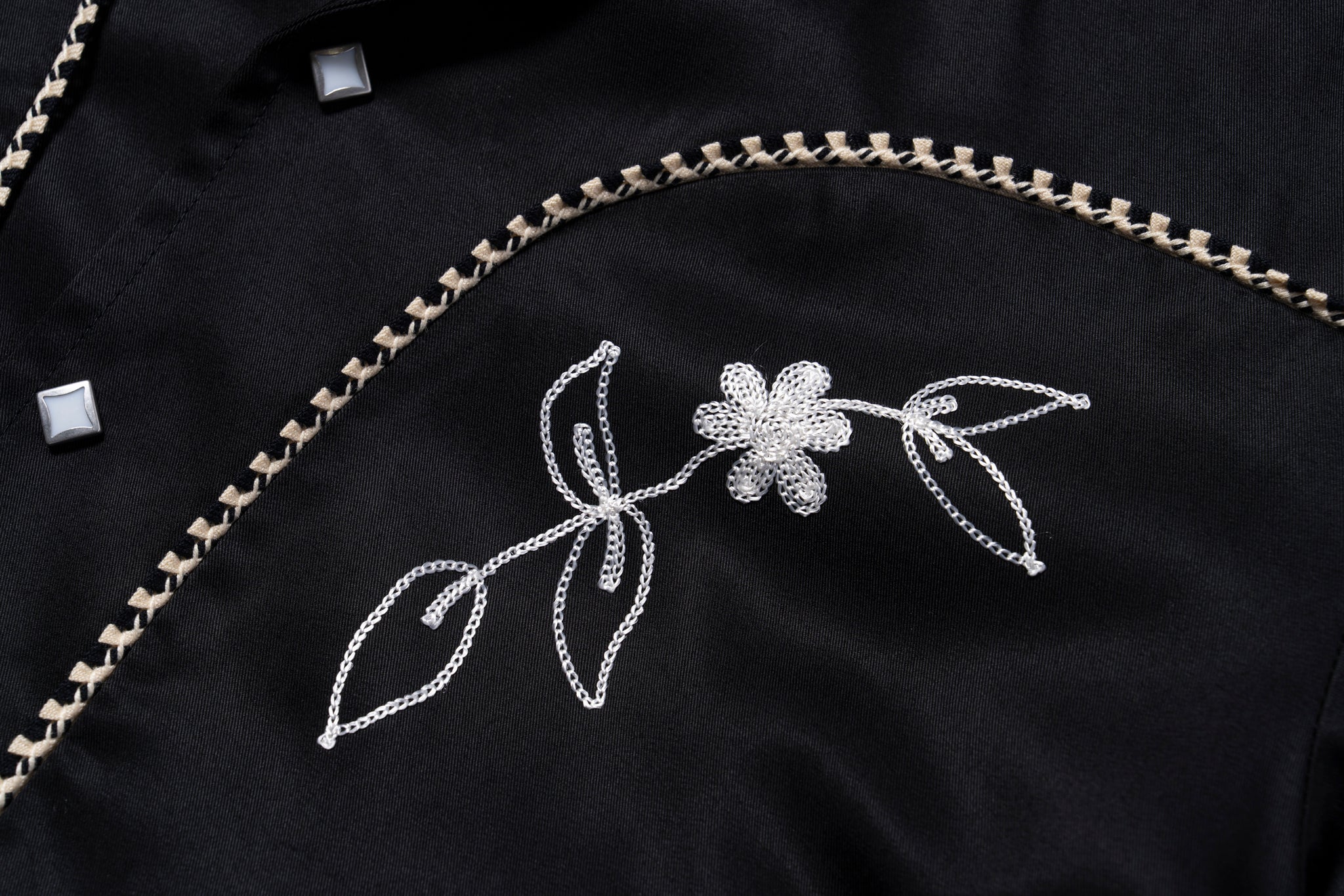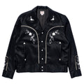 Our EMBROIDERED RAYON WESTERN JACKET is crafted in Japan from rayon with a tencel lining for added comfort. It features piping details, a snap-button front and sleeve cuffs, slit pockets, and intricate chain-stitched floral embroidery.
