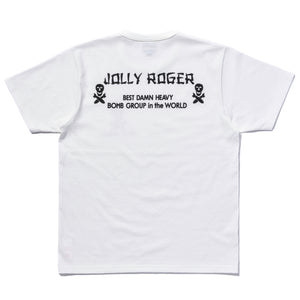 The MILITARY TEE / JOLLY ROGER, BEST DAMN GROUP is a mid-weight ringer tee cut from 100% 8oz. Cotton and sewn 100% cotton thread. The t-shirt has been hand-printed at our Kobe HQ with a JOLLY ROGER skull and bones logo on the front chest and BEST DAMN GROUP motif on the rear.
