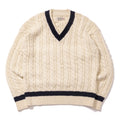 The v-necked cable-knit jumper started life as a wool Cricket Jumper in late 19th Century England. Wool was the de facto performance textile of its day and was the most suitable material of the time for playing in wet conditions. To a certain extent, it wicks away sweat and moisture, and so it was used in most athletic garments. The TILDEN KNIT SWEATER from Joe McCoy SPORTSWEAR is knitted from 5-gauge slub cotton, making a more comfortable garment for everyday wear. The cable knit construction increased the garment’s durability for sport and its embellishment was well suited to the aristocratic setting of Cricket in turn-of-the-century England. While the contrast stripe design lent itself to being customized in team colors.